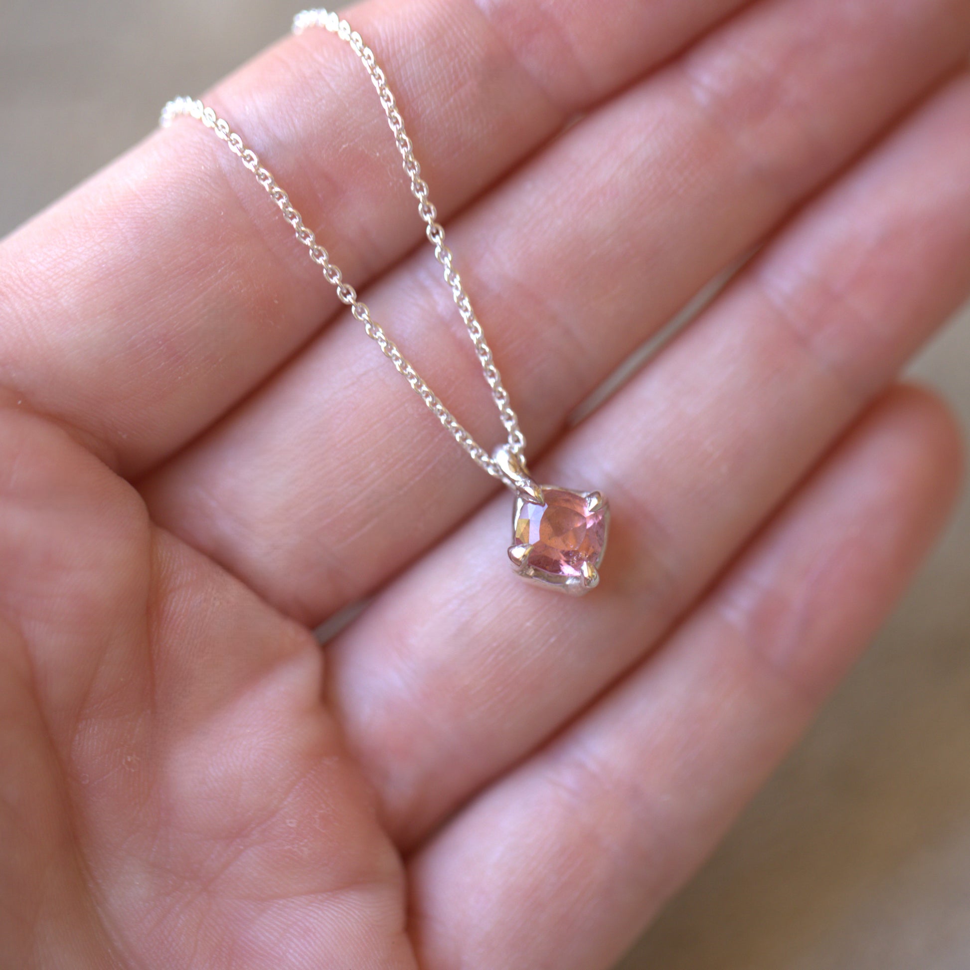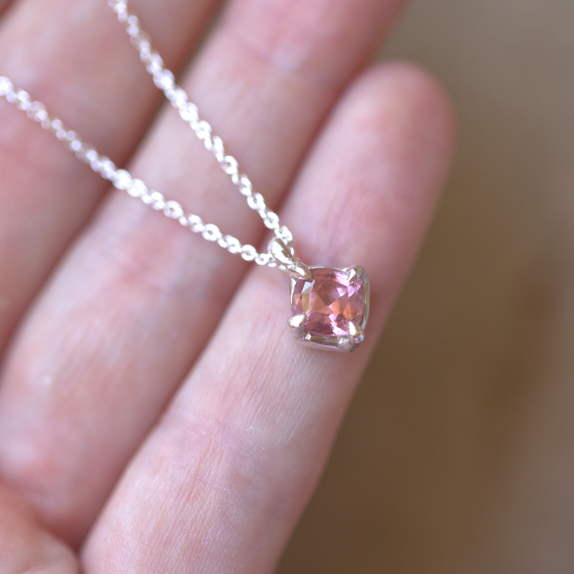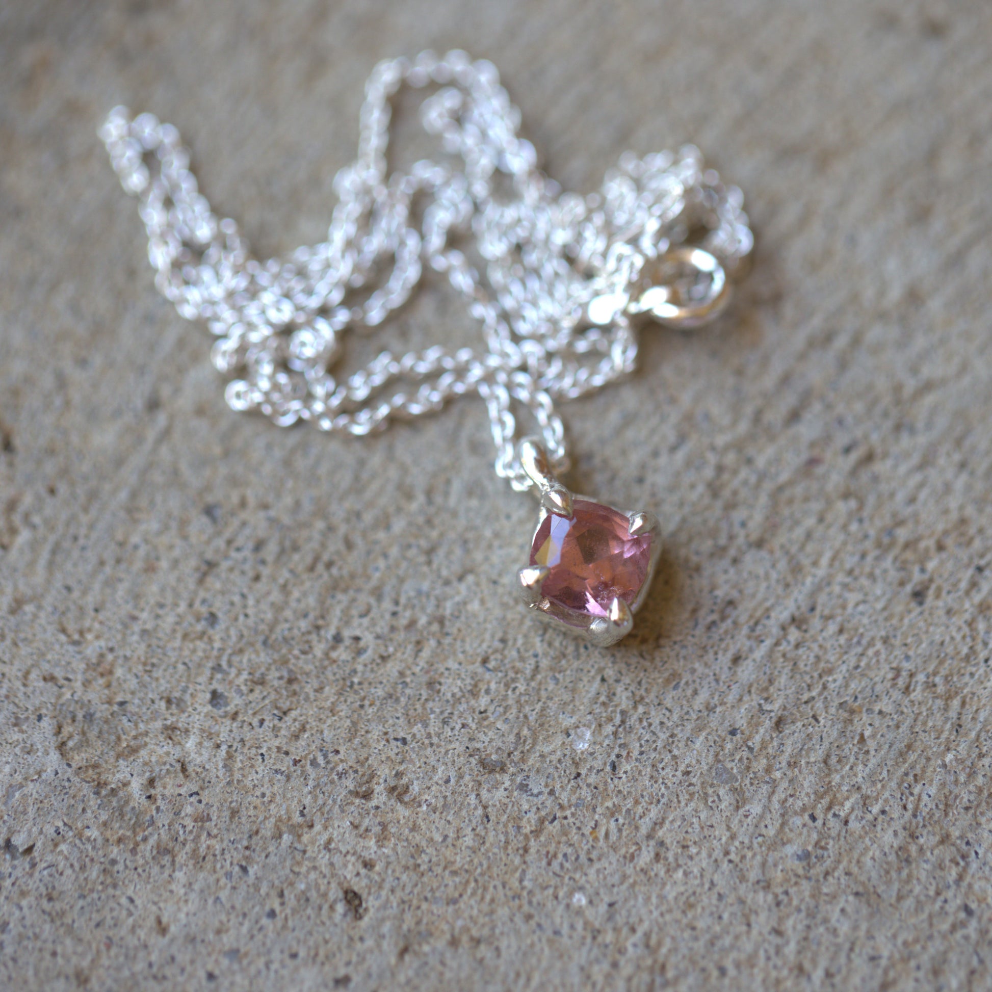 This beautiful handmade Sterling Silver pendant features a stunning natural pink Tourmaline. It has been made into a simple four claw setting that has a very organic vibe to it.