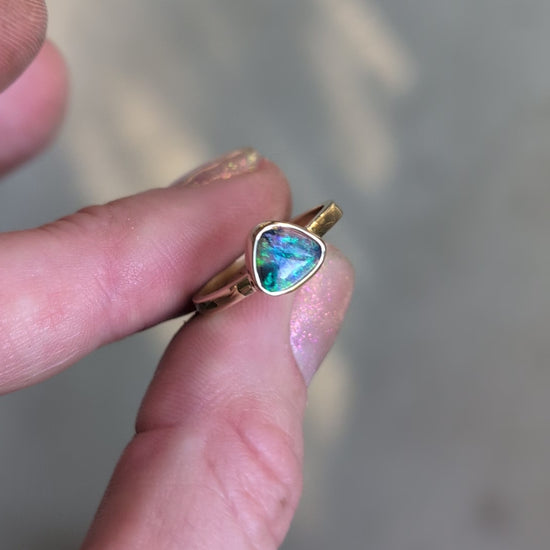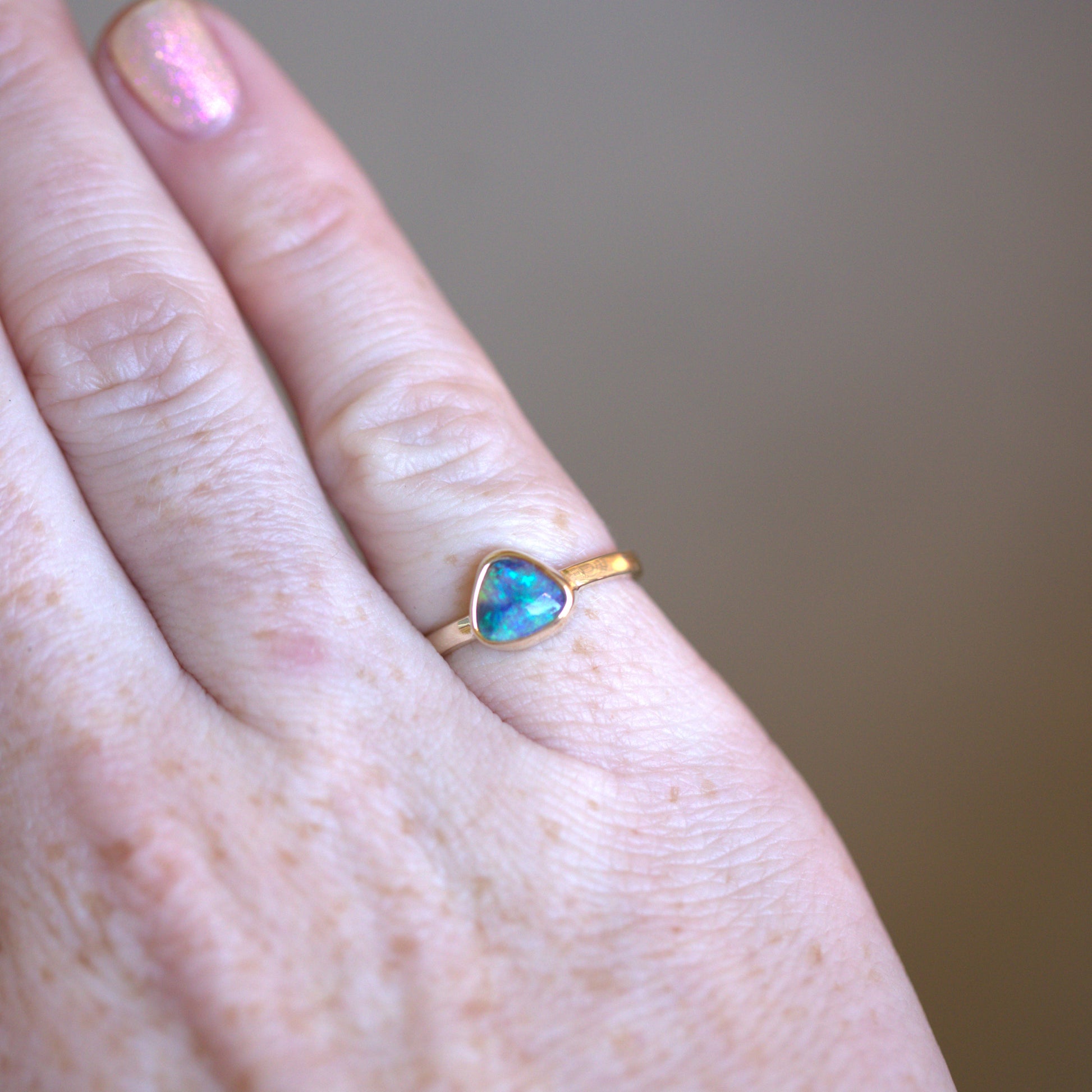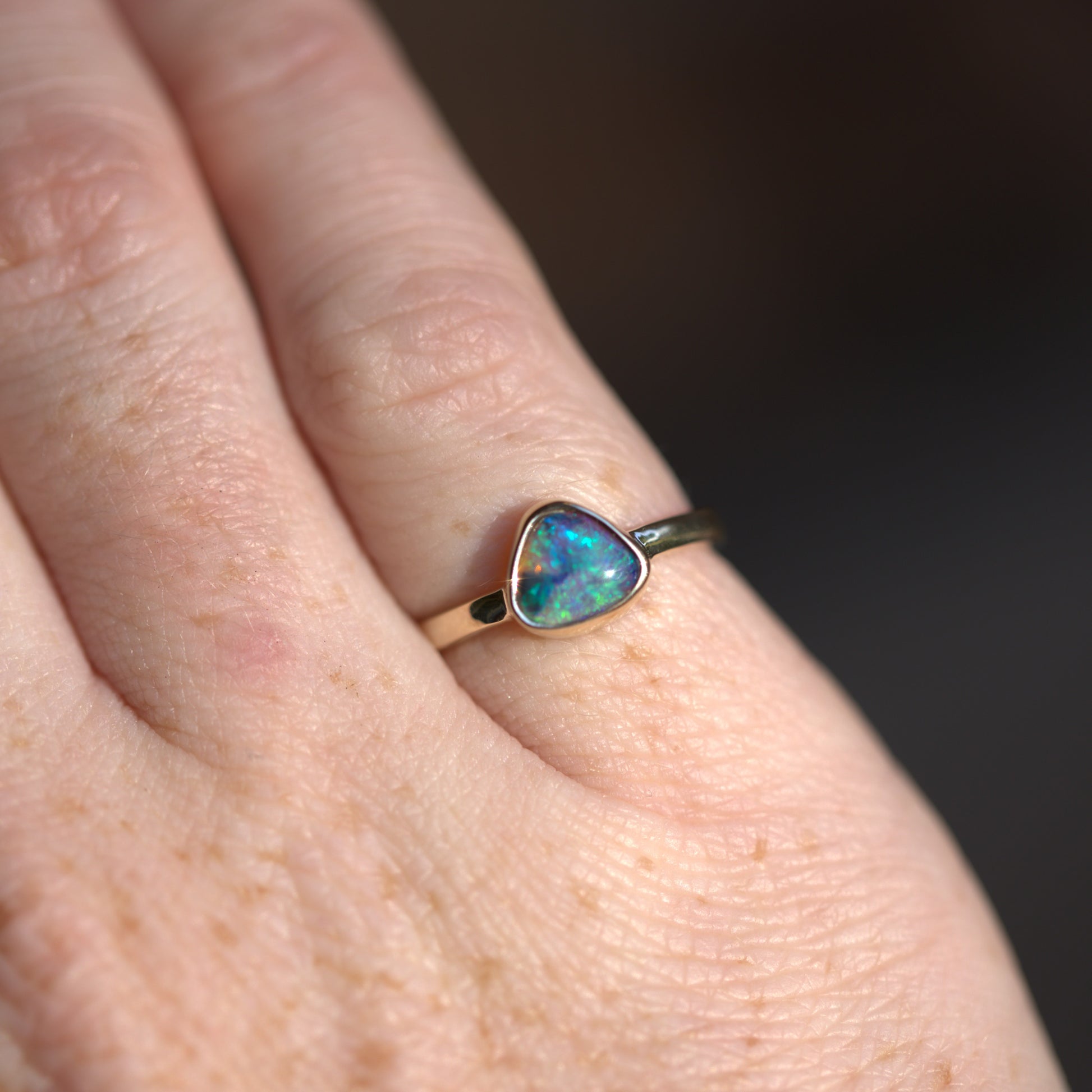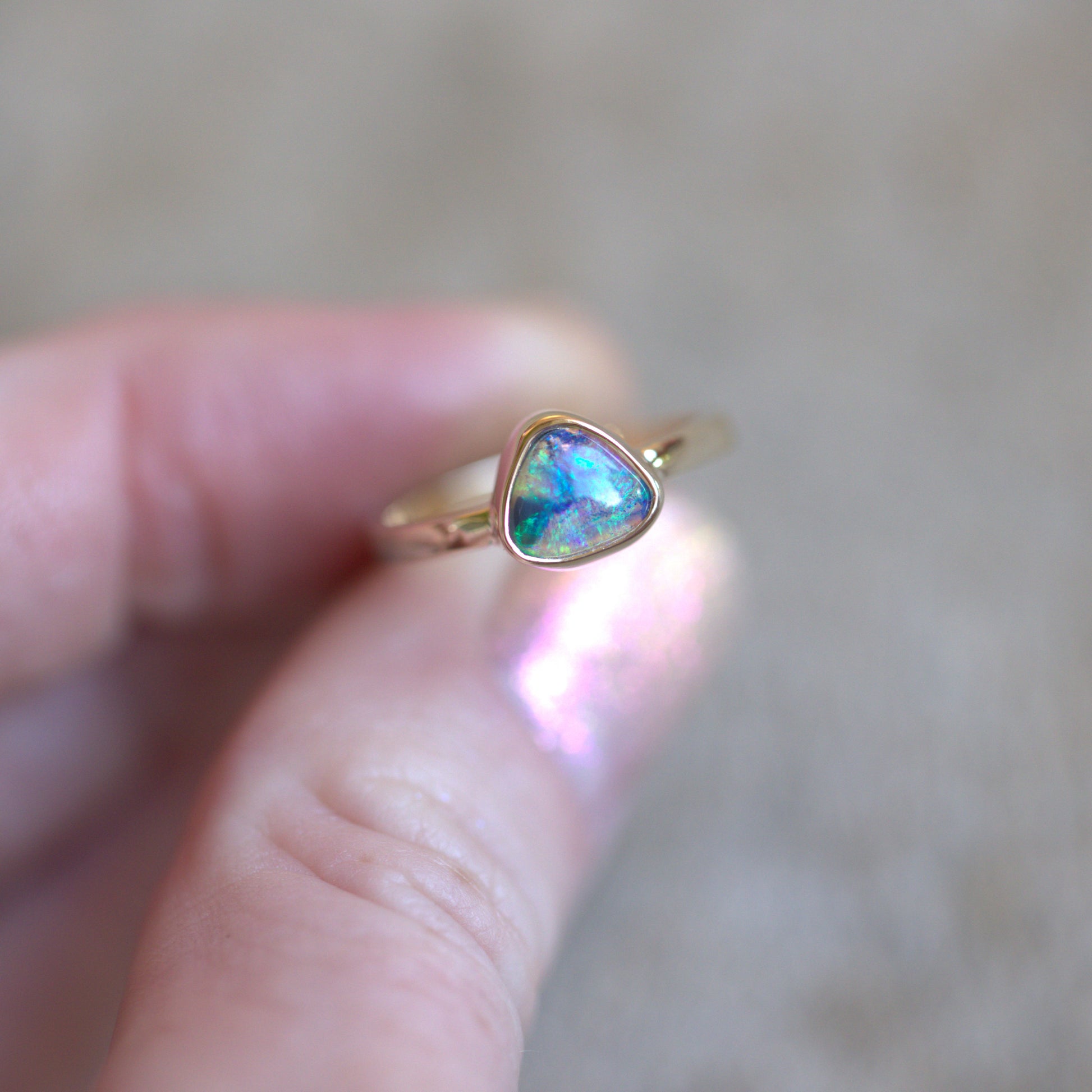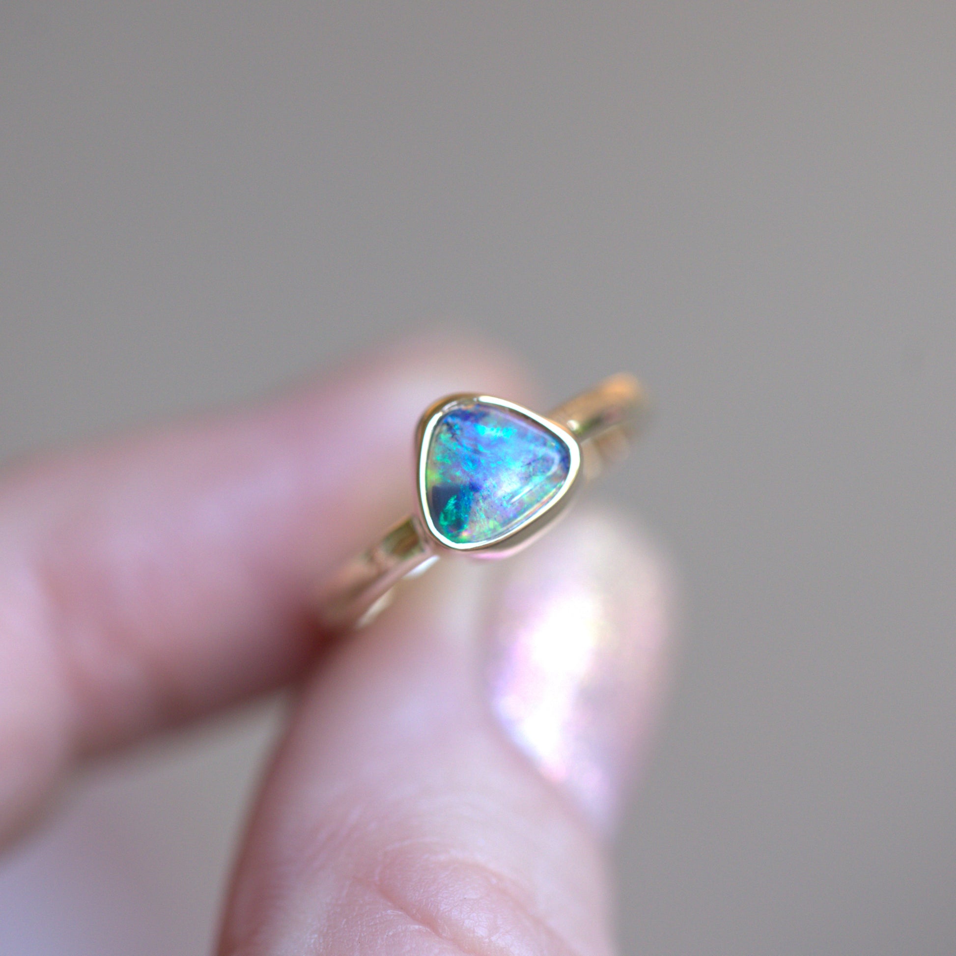 This beautiful tiny Australian Opal gives off ocean and stormy vibes, due to the bright deep blues and greens, mixed in with the dark veining throughout. Although this one is small, it packs a punch and is super bright, especially in the right lighting..!